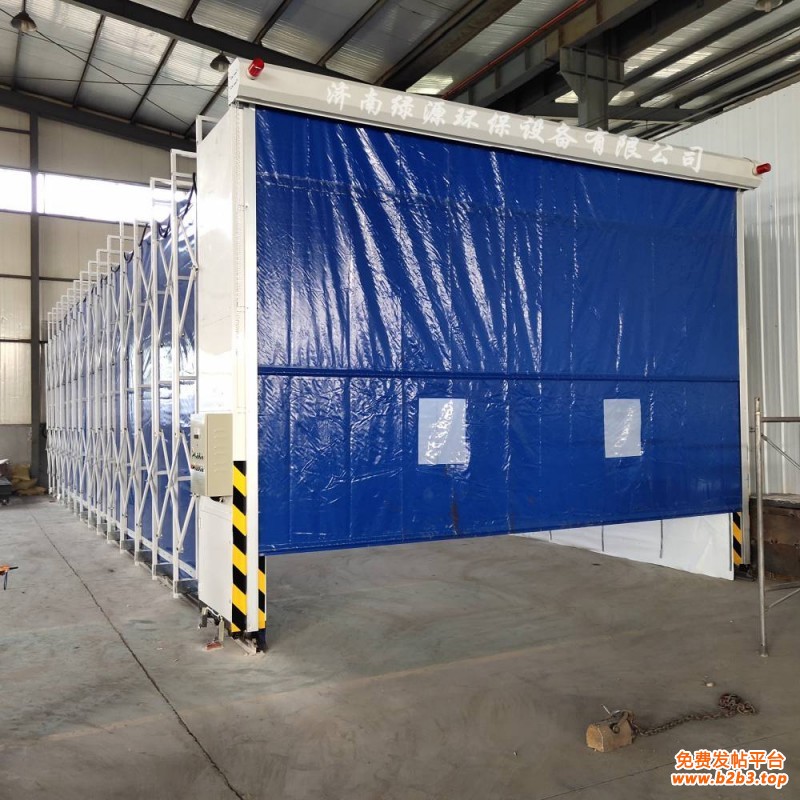 移动伸缩前室由钢架结构和阻燃PVC布组成,通过平行四边形连杆机构或轨道驱动系统实现自动展开与合拢。工作时,前室沿轨道平滑移动至工件上方,形成封闭/半封闭空间进行喷漆;完成后收缩至一侧,节省空间并实现多工序共用场地。其核心系统包括: